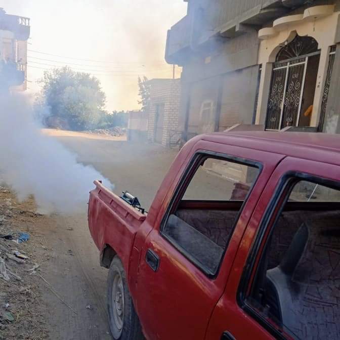 الدفع بسيارة الرش وجهاز الضباب للقضاء على الحشرات الطائرة في المدينة .