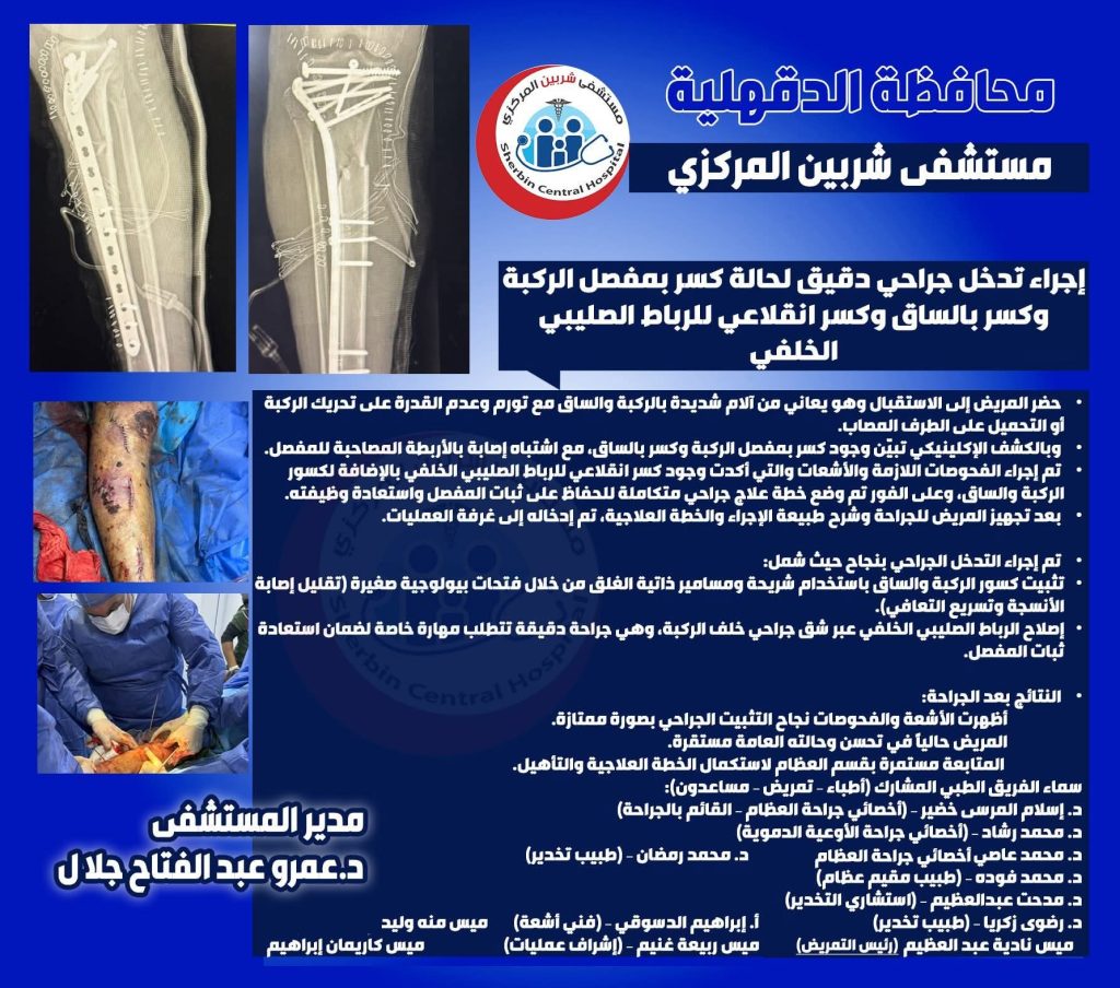 إنجاز جديد يسطره أبطال مستشفي شربين العام تحت إدارة الدكتور عمرو جلال مدير مستشفى شربين المركزي تم إجراء تدخل جراحى دقيق لحالة تعانى من كسر بمفصل الركبه وكسر بالساق وكسر انقلاعى للرباط الصليبى الخلفى