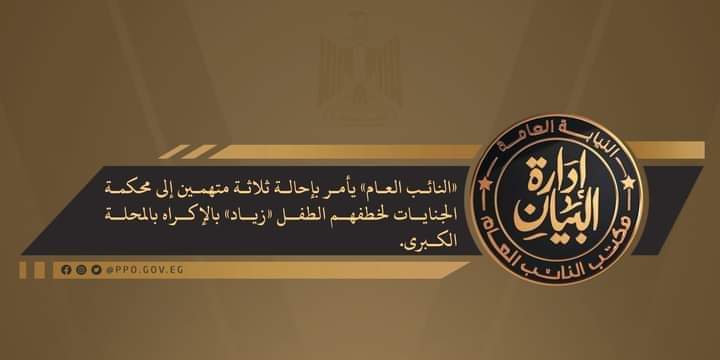 أمر «السيد المستشار النائب العام» بإحالة ثلاثة متهمِينَ محبوسينَ إلى «محكمة الجنايات المختصة»؛ لمعاقبتهم عما أُسند إليهم من ارتكابهم جريمة خطف طفل بالإكراه (بالمحلة الكبرى)، حيث داهموا الحانوت محلّ تواجده واقتادوه داخل سيارة عنوةً إلى عقار احتجزوه به، وصاحَبَ ذلك مطالبتُهم فدية من ذويه نظير إطلاق سراحه، وحيازتهم وإحرازهم سلاحينِ نارييّنِ مششخنين وذخائر ممّا لا يجوز الترخيص بحيازتها أو إحرازها، وإتلافهم السيارة المستخدمة في الجريمة وغير المملوكة لهم بإضرام النيران بها إخفاءً لجريمتهم.