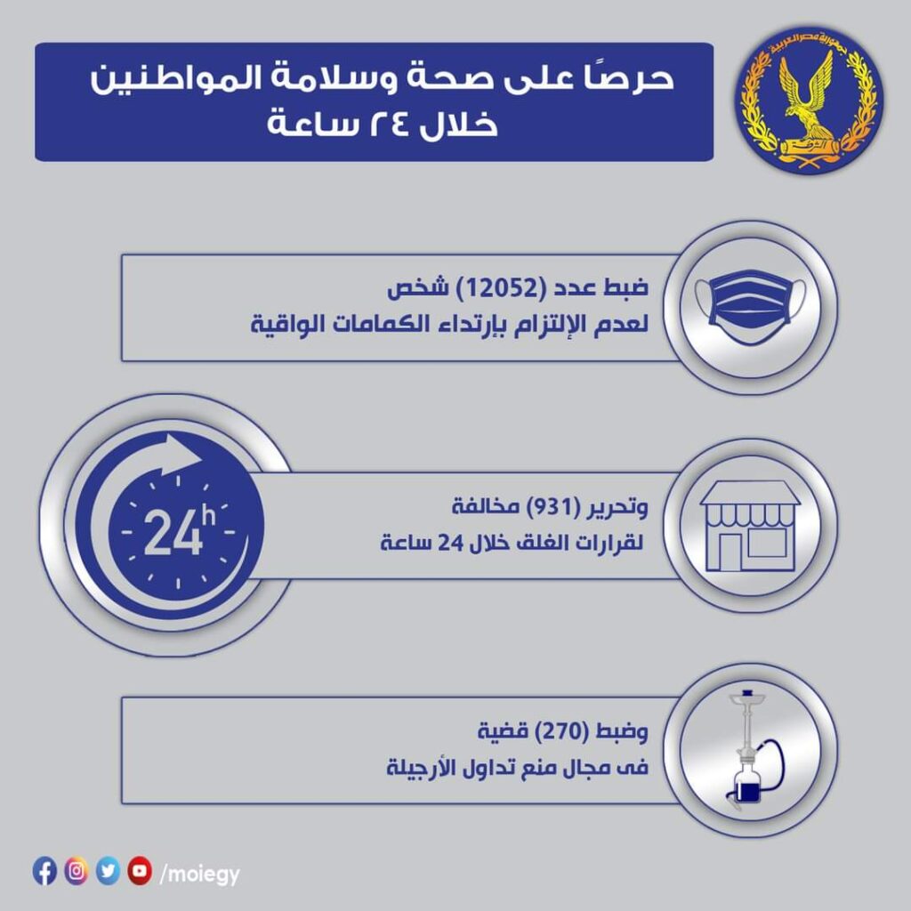 ضبط عدد (12052) شخص لعدم إرتدائهم الكمامات الواقية ، وتم التصالح وسداد الغرامة المقررة لعدد (11927) شخص ، وإتخاذ الإجراءات القانونية والعرض على النيابة العامة حيال (125) شخص لم يسددوا الغرامة المقررة.