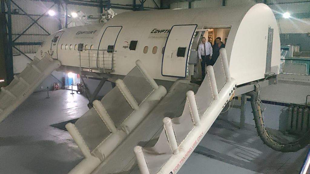 أجرت أكاديمية مصر للطيران للتدريب تجربة طوارئ افتراضية لتدريب الطيارين والمضيفين على إخلاء طائرة من ركابها بشكل سريع عبر زلاقة الإخلاء القابلة للنفخ نتيجة حدث طارئ على متن الطائرة، حيث أن مصر للطيران تقوم بتجهيز طائراتها بالعديد من تجهيزات الأمان والطوارئ التي يمكن استخدامها في حال وقوع أي حادث.