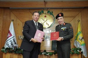 وقع اللواء أ ح / أشرف فارس مدير أكاديمية ناصر العسكرية للدراسات العليا بروتوكول تعاون مع الأستاذ الدكتور / معوض الخولى رئيس جامعة المنصورة الجديدة .