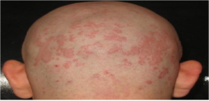 حيث يُصاحبها ظهور بقع دهنية متقشرة على سطح الجلد