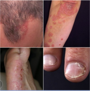وتتسبّب هذه الفطريات بظهور بقع جافة، ومتقشّرة، ومثيرة للحكة