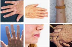 وتتصف هذه الحالة المزمنة بظهور بقع بيضاء اللون وشاحبة المظهر على طبقة الجلد الخارجية