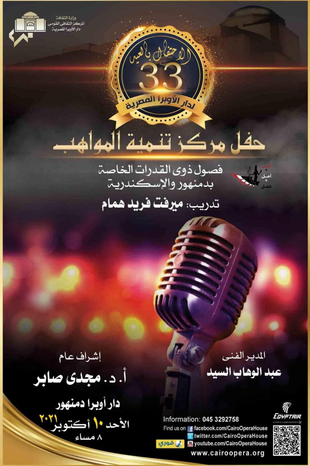 تنظم دار الأوبرا المصرية برئاسة الدكتور مجدي صابر، حفلاً لمركز تنمية المواهب لطلاب فصول ذوى القدرات الخاصة بدمنهور والإسكندرية بقيادة الدكتورة ميرفت فريد، وبقيادة وتدريب الدكتور محمد حسني وذلك على مسرح دار أوبرا دمنهور مساء يوم الأحد القادم الموافق 10 أكتوبر .