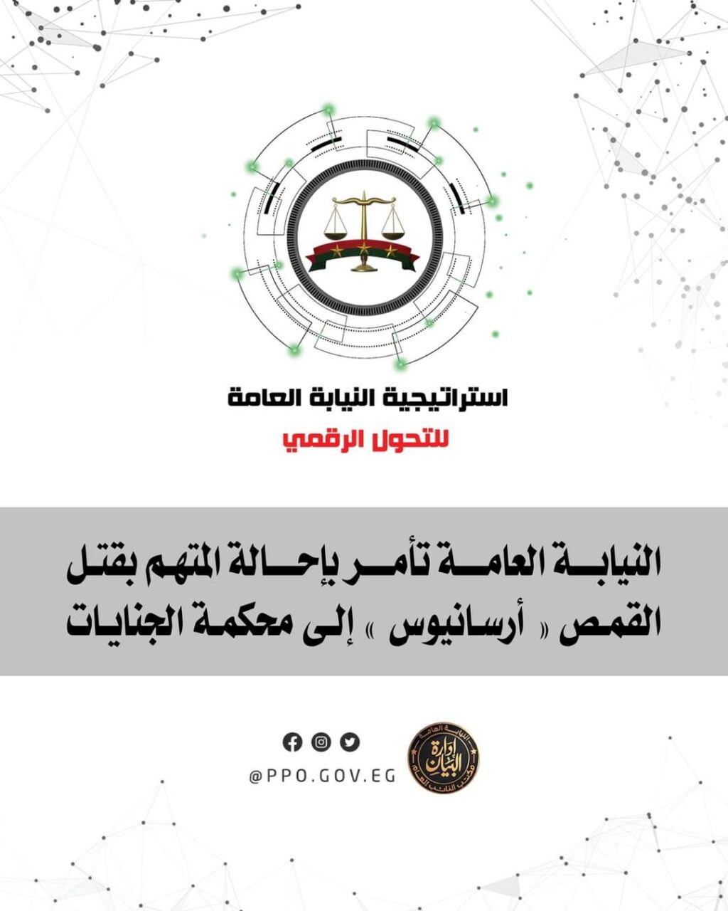 أمرت النيابة العامة اليوم الثلاثاء الموافق التاسع عشر من شهر إبريل الجاري بإحالة المتهم بقتل المجني عليه القمص/ أرسانيوس وديد رزق الله -كاهن كنيسة السيدة العذراء بمحرم بك- إلى محكمة الجنايات المختصة؛ لمعاقبته فيما اتُّهم به من ارتكاب جريمة القتل العمديّ، وإحراز سلاح أبيض.
