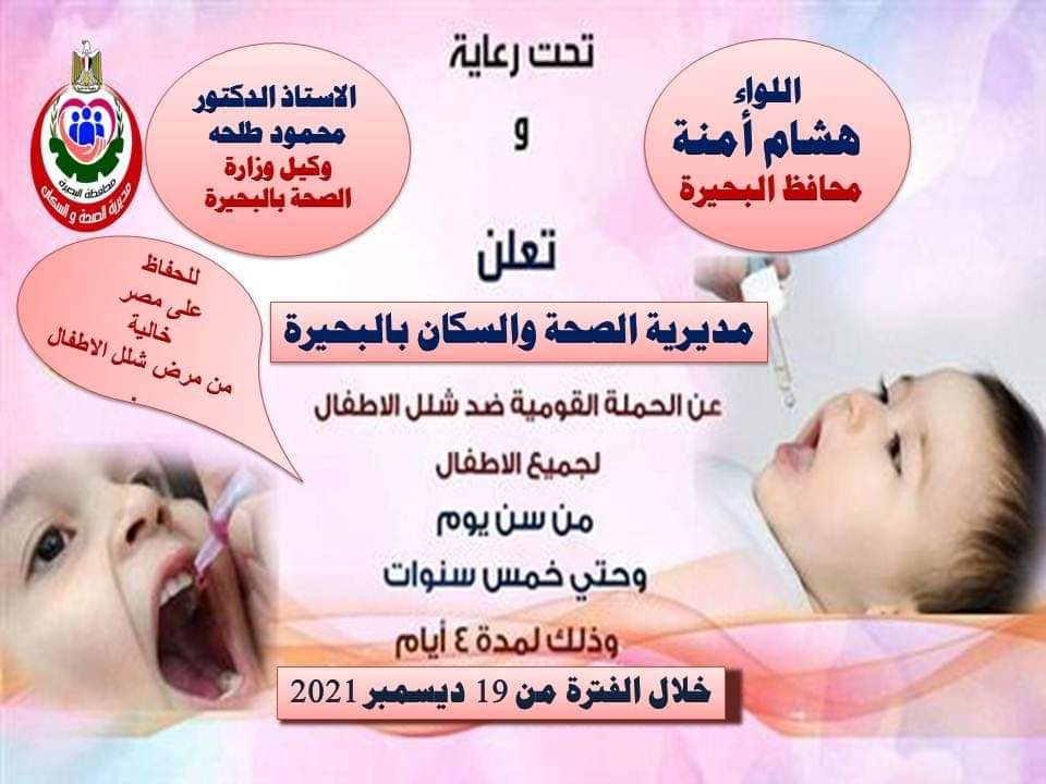 أعلن اللواء هشام آمنة – محافظ البحيرة عن بدء تنفيذ الحملة القومية للتطعيم ضد مرض شلل الأطفال إعتباراً من يوم الأحد الموافق 19ديسمبر والتى تستمر لمدة أربعة أيام حتى الأربعاء 22 ديسمبر .