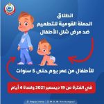 إنطلاق الحملة القومية للتطعيم ضد مرض شلل الأطفال لمدة 4 أيام في الفترة من 19ديسمبر وحتى 22 ديسمبر