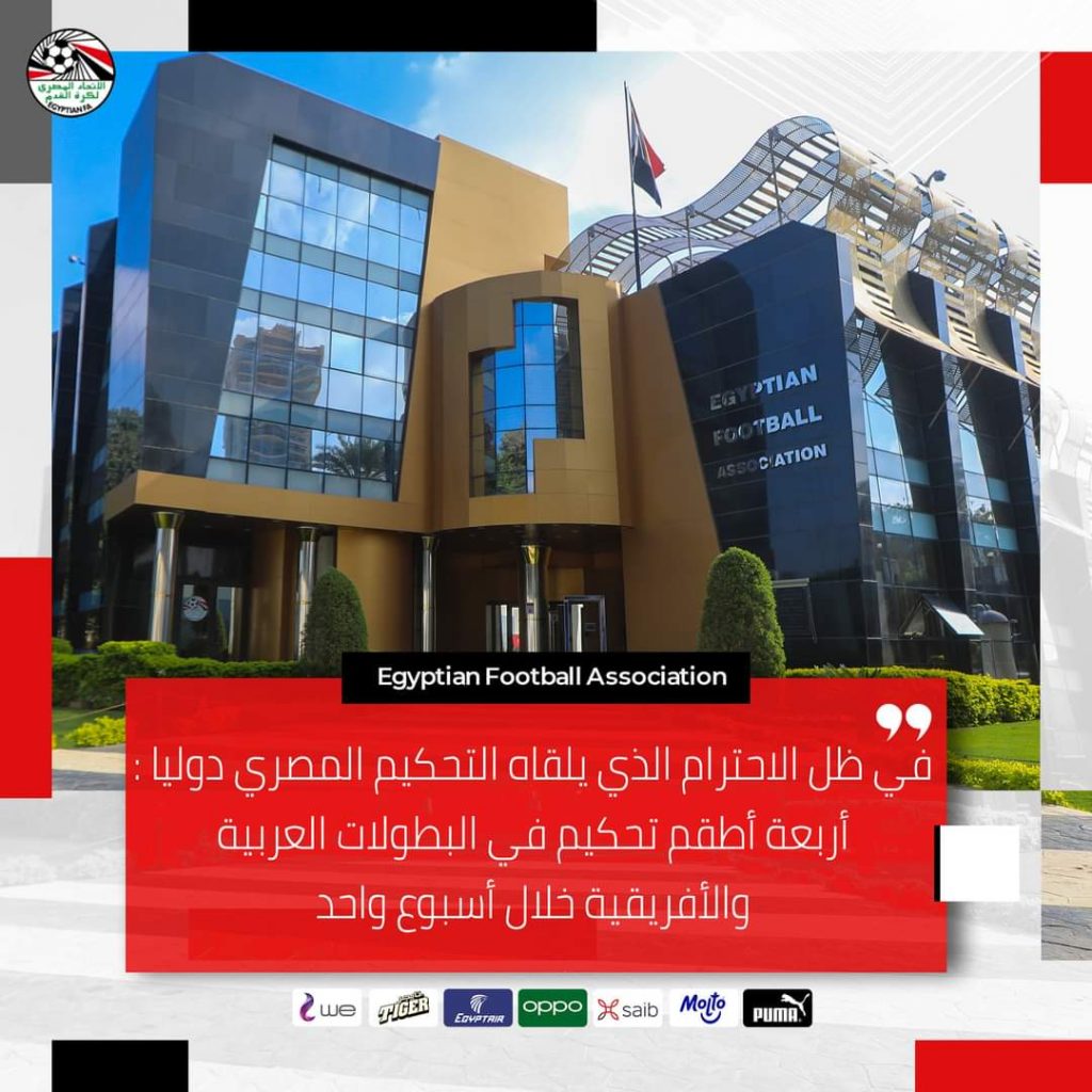 أكد الاتحاد المصري لكرة القدم، أن، أن اختيار 4 أطقم تحكيم مصرية في البطولات العربية والإفريقية خلال أسبوع واحد، يدلل على الاحترام الذي يحظى به التحكيم المصري على المستوى الدولي.