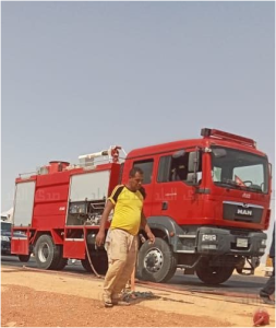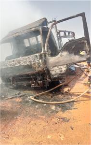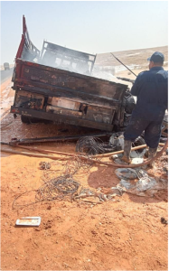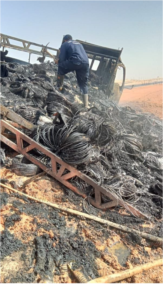 وتبين من المعاينة والفحص نشوب حريق في السيارة رقم 3685 ب ف ط نصف نقل محملة بكابلات الكهرباء.
