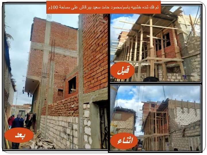 100 مترتقريبا بيرقاش كما تم فك شده خشبية على مساحة98م بذات الكوم ببرقاش مخالفة رخصة بناء وتم مصادرة التشوينات مع اتخاذ الإجراءات القانونية حيال المخالفين .