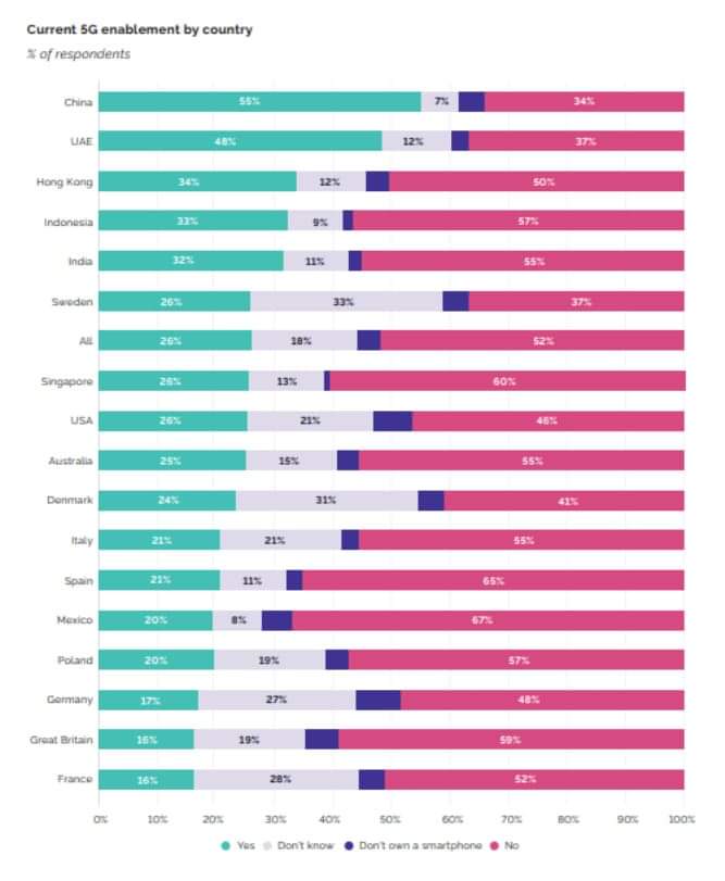 كشف استطلاع أن 52% من المبحوثين في 17 دولة حول العالم أكدوا أنهم لا يستخدمون تكنولوجيا الجيل الخامس (تقنية 5G) في هواتفهم المحمولة، مقابل حوالي ربع المبحوثين (26٪) يستخدمونها. الصين والإمارات العربية على رأس قائمة الدول التي تستخدم هذه التقنية، وذلك وفقًا لنتائج استطلاع الرأي الذي أجرته مؤسسة “يوجوف” على عيّنة من المبحوثين في 17 دولة حول العالم؛ للتعرف على رؤيتهم لخدمات تكنولوجيا الجيل الخامس، ومدى استخدامهم لها.