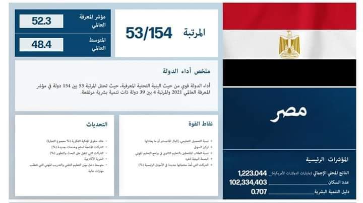 أطلق مؤشر المعرفة العالمي تقريره لعام 2021 في إمارة دبي بدولة الإمارات العربية المتحدة، ليعلن حصول مصر على المركز الأول إفريقيًا، حيث حصلت مصر على المركز 53 على مستوى 154 دولة للعام الحالي، لتقفز 19 مركزًا مقارنة بالعام الماضي (المركز 72 على مستوى 138 دولة خلال العام الماضي 2020).
