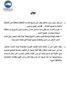 اعلن حزب مستقبل وطن منذ قليل عن قرار فصل النائب مصطفي سليمان ابن مركز صدفا محافظة أسيوط وذلك عم نسب له بتعديه علي سيدة .