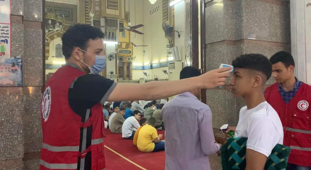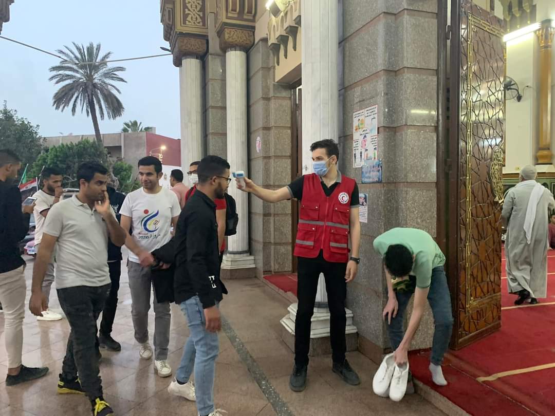 ومن جانبه تواجد فرق الهلال الأحمر محيط المسجد لاتخاذ كافة الاجراءات الاحترازية لمجابهة ڤيروس كورونا كرش الكحول وقياس درجة حرارة المصلين.
