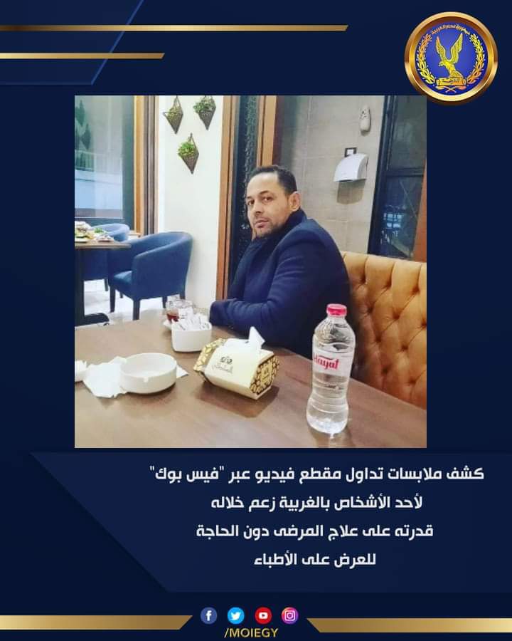 كشف الأمن العام ملابسات ما تبلغ للإدارة العامة لتكنولوجيا المعلومات ضد أحد الأشخاص يدعى – ” محمود رجب البحراوي ” لقيامه بنشر مقطع فيديو عبر حسابه الشخصى على موقع التواصل الإجتماعى “فيس بوك” زعم خلاله قدرته على علاج المرضى دون الحاجة للعرض على أطباء.