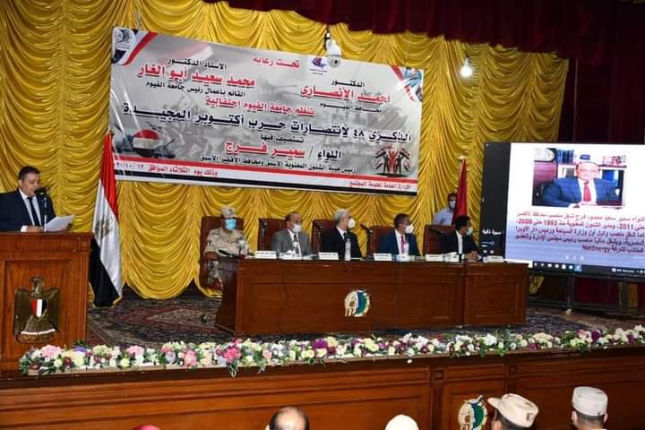 شهد الدكتور أحمد الأنصاري محافظ الفيوم، الاحتفال الذي نظمته جامعة الفيوم، بالذكرى الـ 48 لانتصارات حرب أكتوبر المجيدة، بحضور الدكتور محمد عماد نائب المحافظ، والدكتور محمد سعيد أبو الغار القائم بأعمال رئيس جامعة الفيوم، واللواء سمير فرج رئيس هيئة الشئون المعنوية الأسبق بالقوات المسلحة، أحد قادة حرب السادس من أكتوبر 1973، ومحافظ الأقصر الأسبق، والعميد أحمد حسين بدوي المستشار العسكري للمحافظة، والدكتور محمد التوني معاون المحافظ، والدكتور أحمد جابر شديد رئيس جامعة الفيوم السابق، وعمداء الكليات وأعضاء هيئة التدريس والإداريين، وعدد من أعضاء مجلسي النواب والشيوخ، وممثلي الأزهر والأوقاف والكنيسة، وطلاب الجامعة.