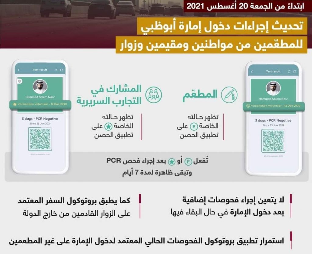وصرحت اللجنة أن برتوكول الفحوصات الحالي المعتمد لدخول إمارة أبوظبي سيستمر تطبيقه على غير المطعمين من مواطنين ومقيمين وزوار، والذي يتطلب نتيجة فحص مسحة الأنف /PCR/ استلمت خلال 48 ساعة أو نتيجة فحص الليزر /DPI/ استلمت خلال 24 ساعة، مع إجراء فحوصات إضافية في حال البقاء في الإمارة كما هو معلن سابقا.