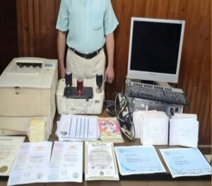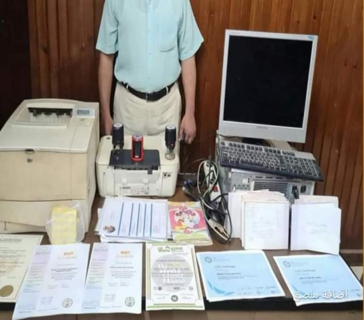 عقب تقنين الإجراءات تنسيقاً مع قطاع الأمن العام ومديرية أمن الغربية أمكن ضبطه ، وبتفتيش مقر الأكاديمية المشار إليها عُثر على (مجموعة كبيرة من الشهادات بأسماء أشخاص مختلفة تفيد حصولهم على دورات تدريبية “مزورة” – مجموعة كبيرة من الشهادات باللغة الأجنبية بأسماء أشخاص مختلفة منسوبة لجامعات دولية “مزورة” – مجموعة كبيرة من العلامات المائية التى توضع على الشهادات المنسوب صدورها للأكاديمية المشار إليها 3 أكلاشية تقرأ بصمتها بإسم الأكاديمية مجموعة كبيرة من ملفات الإلتحاق بالأكاديمية مرفق بها صور مستندات خاصة بالدارسين بأسماء أشخاص مختلفة 2 دفتر مدون بها أسماء راغبى الإلتحاق بالأكاديمية والمبالغ المالية المتحصلة منهم 16دفتر إيصال إستلام نقدية باسم ذلك الكيان جهاز كمبيوتر وطابعة بفحصه فنياً تبين أنه محمل ببرنامج “الفوتو شوب” وصور الشهادات المضبوطة خالية البيانات ومعدة للتزوير)