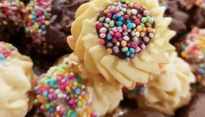 8. اضغطي على الكيس فوق الصينية لتنزل قطعة بيتي فور مزخرفة. اكملي تشكيل بقية البيتي فور مع ترك مسافة ١ سنتيمتر بين القطع.