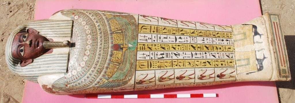 ويعتبر هذا التابوت هو أحد التواليت الخشبية الملونة التي تم اكتشافها حديثا بمنطقة سقارة الأثرية من خلال البعثة الأثرية التابعة للمجلس الأعلى للآثار، وهو تابوت للكاهن بسماتيك بن أوزير، ذو الهيئة الآدمية من الخشب الملون، وقد زُيِّن بقلادة نباتية كبيرة تسمى (الأُوْسِخ)، تنتهي برأسي صقر، وتظهر المعبودة (نوت) ناشرة أجنحتها، وتحمل ريشتي الماعت (الحق والعدالة). أما الجزء الأوسط منه فقد زخرف بنصوص تقدمة القرابين وتعاويذ دينية والجوانب محاطة بصفين لمعبودات حاملة صولجان (الواس) بأيديها، وفي الجزء السفلي تظهر هيئتان للمعبود أنوبيس فوق مقصورته أمام المتوفى.