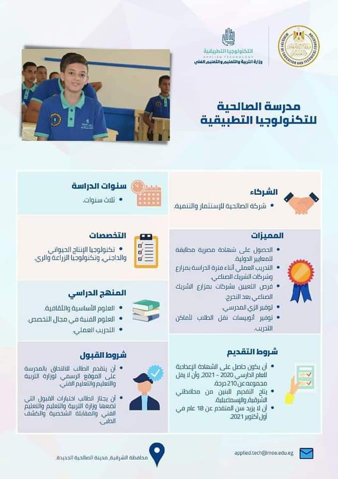 6- مدرسة الصالحية للتكنولوجيا التطبيقية، يتاح التقديم للبنين من محافظتي الشرقية والإسماعيلية، وأن يكون المتقدم حاصل على مجموع لا يقل عن 210 بالشهادة الإعدادية للعام الدراسي 2020 -2021، وألا يزيد عمره عن 18 عام في أول أكتوبر 2021.