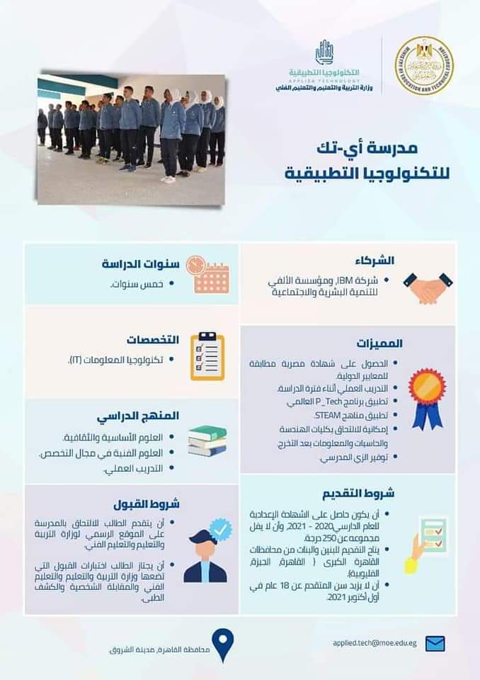 9- مدرسة أي-تك للتكنولوجيا التطبيقية، يتاح التقديم للبنين والبنات من محافظات القاهرة الكبرى (القاهرة، الجيزة، القليوبية)، وأن يكون المتقدم حاصل على مجموع لا يقل عن 250 بالشهادة الإعدادية للعام الدراسي 2020 -2021، و ألا يزيد عمره عن 18 عام في أول أكتوبر 2021.