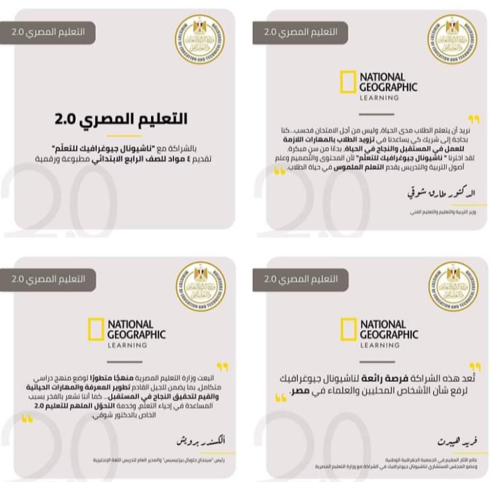 أعلنت وزارة التربية والتعليم والتعليم الفني، عن توقيع اتفاقية تعاون طويلة الأمد مع ناشيونال جيوغرافيك للتعلم National Geographic Learning، إحدى شركات مجموعةCengage، من أجل التعاون في وضع المناهج الدراسية للصفوف من الرابع إلى السادس الابتدائي، لما يقرب من سبعة ملايين طالب.