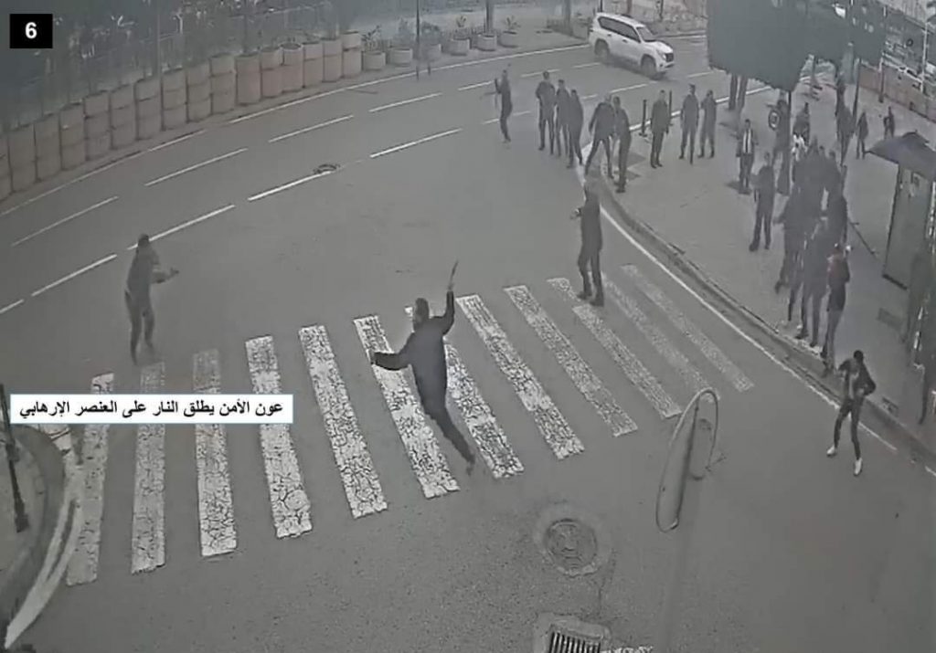 وأشارت الوزارة إلى أنه رغم محاولة التصدي له من قبل أفراد الأمن وتكرار دعوته للاستسلام وإلقاء ما بيديه، واصل مواجهة كل من يقترب منه مشهرا الساطور ، ومستمرا في الجري يمينا ويسارا ثم باقترابه نحو مبنى الوزارة أشهر سلاحه مرة أخرى محاولا الاعتداء على فرد أمن كان في مواجهته الأمر الذي اضطره إلى إطلاق النار عليه فسقط أرضا وتمت السيطرة عليه وتجريده مما كان يحمله ونقله بواسطة سيارة الإسعاف للمستشفى للعلاج.