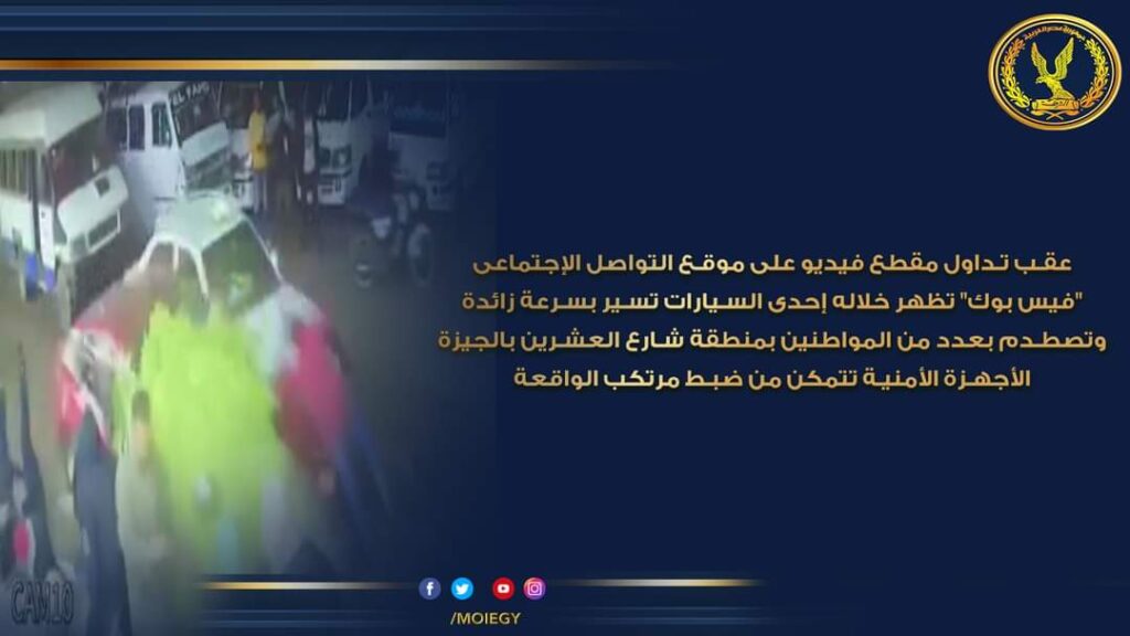 كشف ملابسات تداول مقطع فيديو على موقع التواصل الإجتماعى “فيس بوك” تظهر خلاله إحدى السيارات تسير بسرعة زائدة وتصطدم بعدد من المواطنين بمنطقة شارع العشرين بالجيزة.