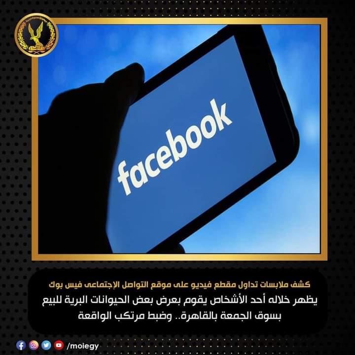 كشف ملابسات ما تم تداوله على موقع التواصل الإجتماعى “فيس بوك” بشأن مقطع فيديو يظهر خلاله أحد الأشخاص يقوم بعرض بعض الحيوانات البرية للبيع بـ سوق الجمعة بمنطقة السيدة عائشة – بدائرة قسم شرطة الخليفة بالقاهرة.