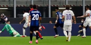 كان الحذر الدفاعي من الفريقين كان عنواناً لللقاء مع محاولات الفريقين من الوصول إلى المرمى من هجمات متفرقة ، و قد شهد اللقاء تألق حارس الفريق الملكي” تيبوا كورتوا ” و الذى له دور فى إنقاذ الريال من هزيمة محققة من النيراتزوري فى المباراة ، و قد حاول الريال تهديد مرمى النيراتزوري من خلال الهجمات و استمرت أحداث المباراة على التعادل السلبي و سيطرة الإنتر على مجرياتها ، حتى نجح البرازيلي ” دو جوس ” فى خطف الأفاعي الإيطالية فى عقر دارهم ، ليكرر الميرينجي ما حدث فى دور المجموعات فى الموسم الماضي من دوري الأبطال ، حين حقق الريال الفوز بثنائية نظيفة فى المباراة التى جمعتهما على ملعب ” جوزيبى ماتسيا ” فى يوم الأربعاء الموافق ” 25 نوفمبر 2020 ” .