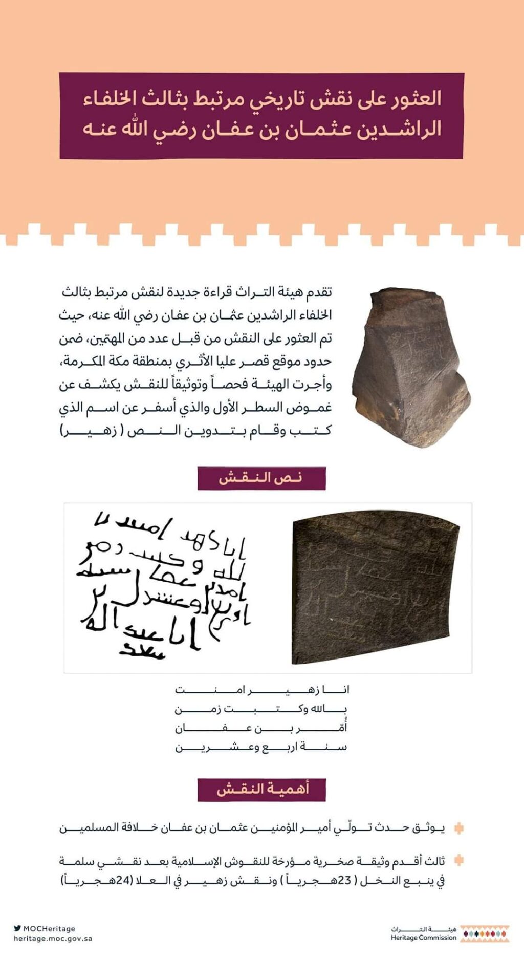 أعلنت هيئة التراث السعودية العثور عن نقش أثري إسلامي مرتبط بثالث الخلفاء الراشدين عثمان بن عفان يعود لما قبل 1419 عاما، ما يجعله ثالث أقدم نقش إسلامي يتم العثور عليه.