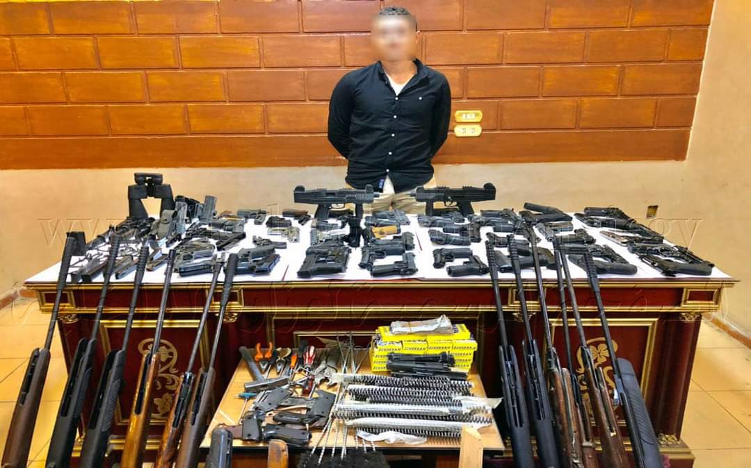 عقب تقنين الإجراءات بالتنسيق مع قطاعى الأمن العام والأمن الوطنى ومديرية أمن القليوبية تم إستهدافة وأمكن ضبطه ضبطه.. وبحوزته (2 رشاش- 40 طبنجة معدلة- 10 طبنجات صوت- 12 بندقية ضغط هواء- كمية من طلقات الصوت- نظارة ميدان- تليسكوب- مبلغ مالى- هاتف محمول- 32 خزينة طبنجة- كمية من أجزاء الأسلحة النارية- أدوات التصنيع).