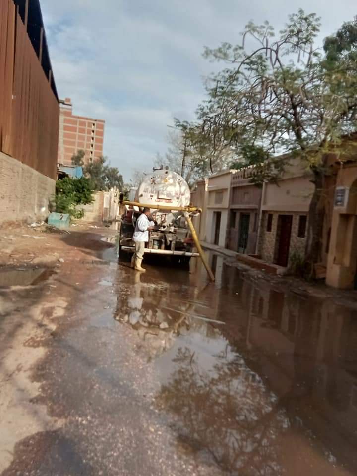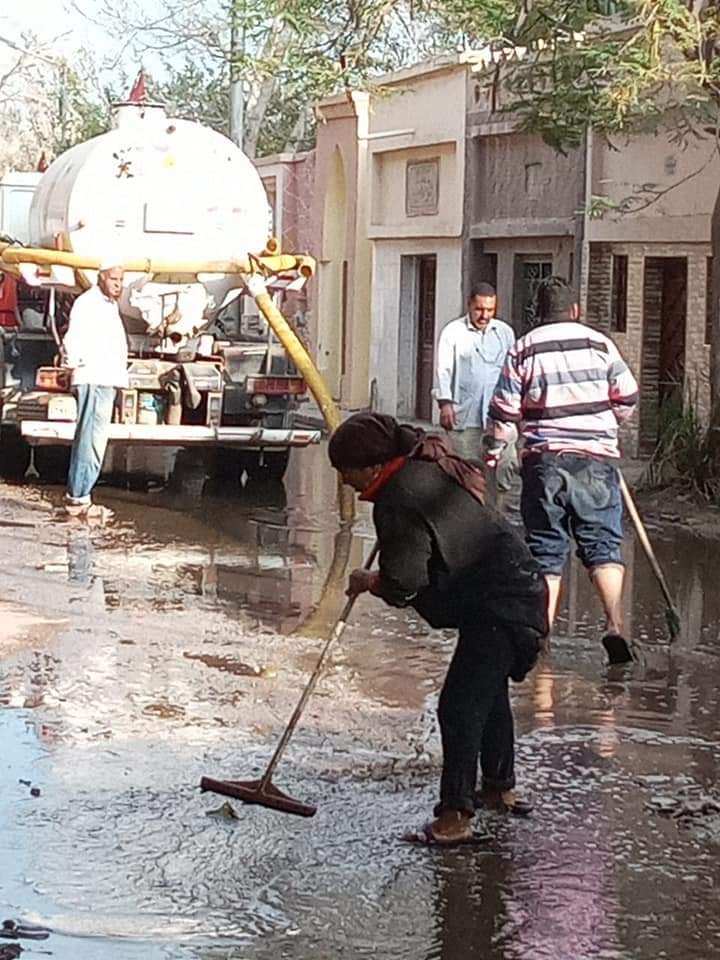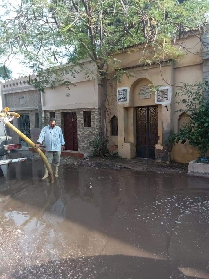 بكسح وشفط تجمعات مياه الأمطار بداخل مقابر العيسوى ، ومازال العمل مستمر على رفع الآثار الناجمة عن الطقس السيئ الذى شهدتة المحافظة بكافة الشوارع الكائنة بنطاق الحى .