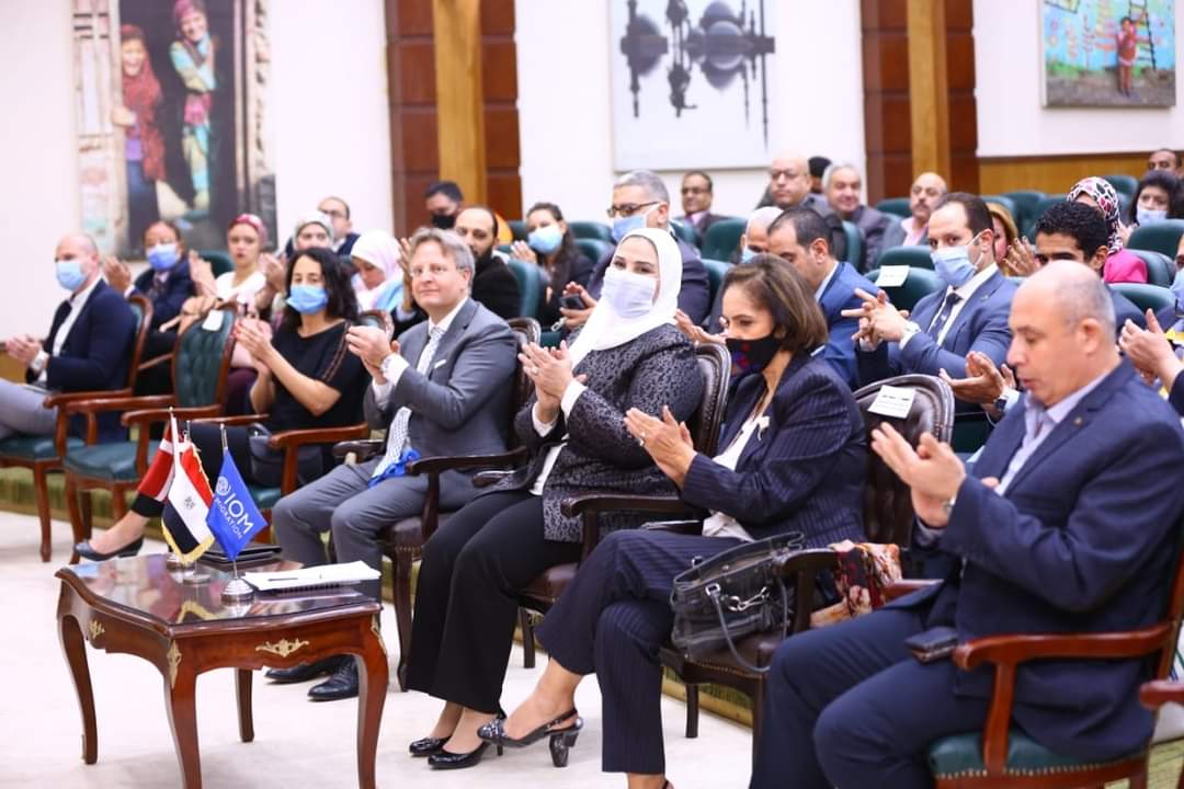 المؤتمر الصحفي بحضور السيدة السفيرة نائلة جبر رئيس اللجنة الوطنية التنسيقية لمكافحة ومنع الهجرة غير الشرعية والاتجار بالبشر، والدكتورة سحر السنباطي أمين عام المجلس القومي للطفولة والأمومة، والسفير سيفن أولينج سفير الدنمارك في القاهرة، والسيد لوران دي بوك رئيس بعثة المنظمة الدولية للهجرة في مصر، والدكتور أحمد محمد فتحي الأمين العام لجمعية الهلال الأحمر المصري بالقليوبية.