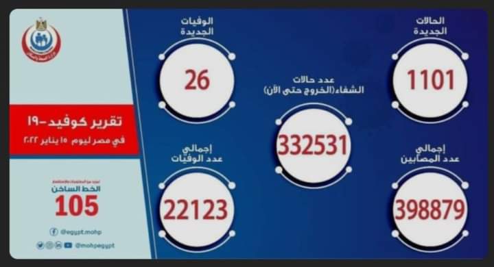 وأوضح الدكتور حسام عبد الغفار المتحدث الرسمي لوزارة الصحة والسكان، أنه تم تسجيل 1101 حالة جديدة ثبتت إيجابية تحاليلها للفيروس ومتحوراته، وذلك ضمن إجراءات الترصد والتقصي والفحوصات اللازمة التي تُجريها الوزارة وفقًا لإرشادات منظمة الصحة العالمية، لافتًا إلى وفاة 26 حالة جديدة.