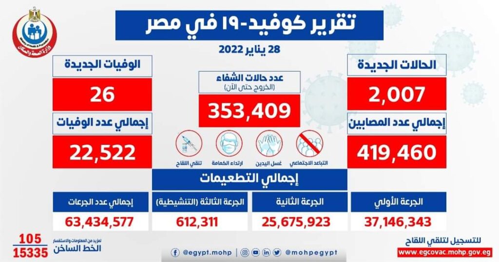 وأشار “عبد الغفار” إلى أن إجمالي العدد الذي تم تسجيله في مصر بفيروس كورونا المستجد حتى الجمعة، هو 419460 من ضمنهم 353409 حالة تم شفاؤها، و 22522 حالة وفاة.