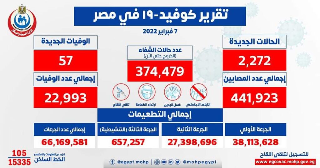 وأوضح الدكتور حسام عبد الغفار المتحدث الرسمي لوزارة الصحة والسكان، أنه تم تسجيل 2272 حالة جديدة ثبتت إيجابية تحاليلها للفيروس ومتحوراته، وذلك ضمن إجراءات الترصد والتقصي والفحوصات اللازمة التي تُجريها الوزارة وفقًا لإرشادات منظمة الصحة العالمية، لافتًا إلى وفاة 57 حالة جديدة.
