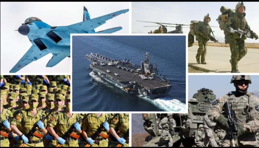 الجيش الامريكى الأول عالمياً الجيش الروسى الثانى عالمياً. الولايات المتحدة 332 مليون نسمة روسيا 142 مليون نسمة. الجيش الأمريكى 2245 مليون جندى، الجيش الروسى 3569 مليون جندى. الجيش الأمريكى 13233 طائرة حربية الجيش الروسى 4144 طائرة حربية. الجيش الأمريكى 1956 مقاتلة الحيش الروسى 789 مقاتلة. الجيش الأمريكى 5436 مرحية قتالية، الجيش الروسى 1540 مروحية قتالية. الجيش الأمريكى 6100 دبابة الجيش الروسى 1300 دبابة. الجيش الأمريكى 40 الف مدرعة الجيش الروسى 27 الف مدرعة. الجيش االأمريكى 490 قطعة بحرية الجيش الروسى 603 قطعة بحرية. الجيش الأمريكى 68 غواصة، الجيش الروسى 64 غواصة. الجيش الأمريكى 740 مليار دولار الجيش الروسى 42 مليار دولار. الجيش الأمريكى 6800 رأس نووى، الجيش الروسى 6370 رأس نووى.