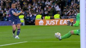 لتأتى الدقيقة التاسعة و الثلاثين من عمر المباراة ، بصاعقة ” مبابى ” و التى وضعت البى إس جى فى المقدمة بعد هجمة مرتدة خاطفة من ” نيمار دا سيلفا ” إلى ” كيليان مبابى ” و الذى توغل داخل منطقة الجزاء للريال ليضرب شباك الميرينجى بالهدف الأول ، ليضع الريال فى مأزق رهيب قبل ينتهى الشوط الأول بتقدم باريسي بهدف نظيف .