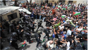 الاعتداء على الجثمان أثناء خروج جثمان الشهيدة شيرين أبو عاقلة، من المستشفى الفرنساوي بحي الشيخ جراح في القدس المحتلة