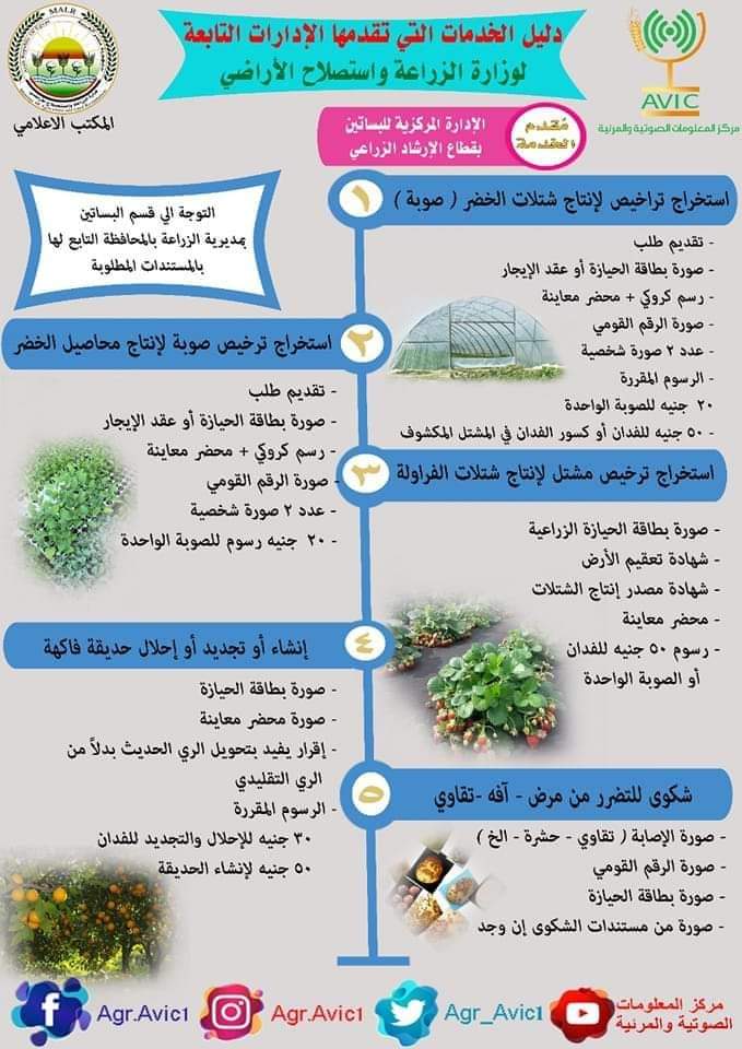 أصدر مركز المعلومات الصوتية والمرئية بوزارة الزراعة واستصلاح الأراضي، والمكتب الاعلامي للوزارة، العدد الثاني من سلسلة دليل الخدمات التي تقدمها الادارات التابعة للوزارة، للمزارع والمربي والمواطن، حيث يستعرض هذا العدد من خلال فيديو وانفوجراف، الخدمات التي تقدمها الادارة المركزية للبساتين التابعة لقطاع الارشاد الزراعي، والاجراءات الواجب اتباعاها للحصول على هذه الخدمات، والمستندات المطلوبه، كذلك الرسوم المقررة.