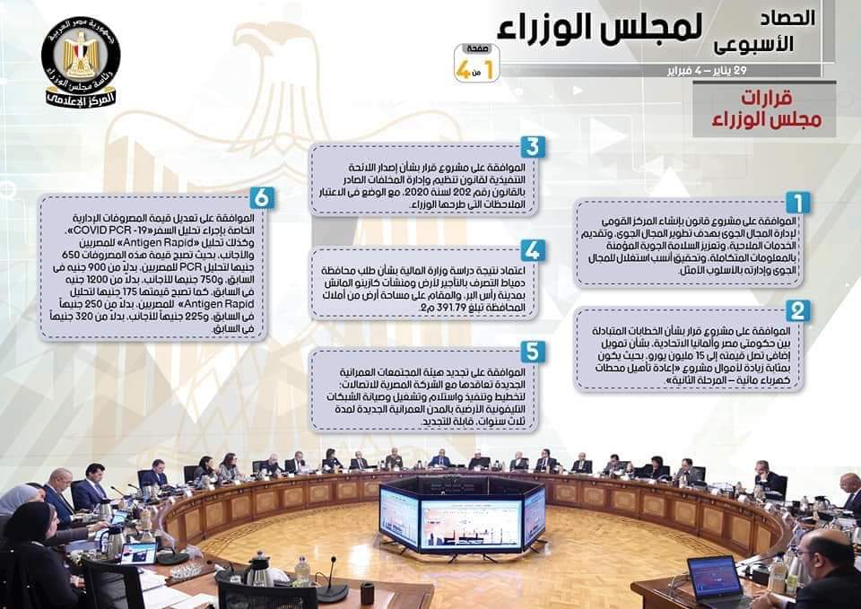 نشر المركز الإعلامي لمجلس الوزراء، تقريراً شمل إنفوجرافات سلط من خلالها الضوء على الحصاد الأسبوعي لمجلس الوزراء، وذلك خلال الفترة من 29يناير حتى 4 فبراير 2022،