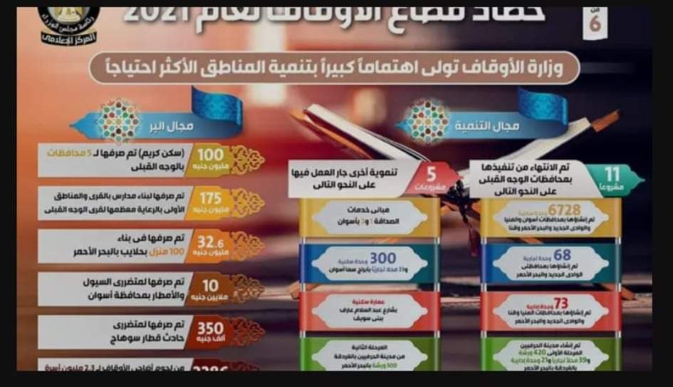 وفي إطار سلسلة تقارير حصاد قطاعات الدولة في عام 2021، نشر المركز الإعلامي لمجلس الوزراء تقريراً تضمن إنفوجرافات تسلط الضوء على حصاد قطاع الأوقاف.