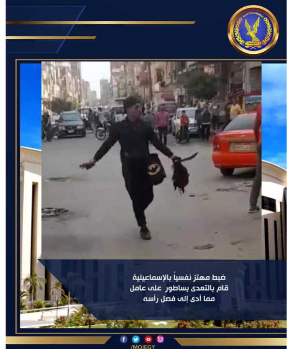 ، أنه تم ضبط مهتز نفسياً بالإسماعيلية.. “سبق حجزه بأحد المصحات للعلاج من الإدمان”، قام بالتعدى بساطور على عامل مما أدى إلى فصل رأسه وكان يهذى بكلمات غير مفهومة .