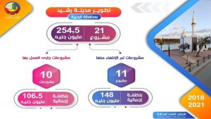 حيث أوضح الٱنفوجراف الأول أن إجمالي عدد المشروعات الخاصة بتطوير مدينة رشيد يبلغ 21مشروع بتكلفة إجمالية 254,5 مليون جنية حيث تم الإنتهاء من 11 مشروع بتكلفة إجمالية 148 مليون جنية وجاري العمل بـ 10 مشروعات بتكلفة إجمالية 106,5مليون جنية .