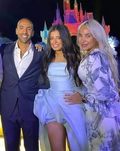 ولفتت ابنة عامر منيب الأنظار في حفل خطوبتها بإطلالة جريئة، حيث ارتدت فستانا بأكمام مكشوفة وطويل من الخلف وقصير للغاية من الأمام، واتسم التصميم باللون البيبي بلو الذي لا يحمل أي تطريزات.
