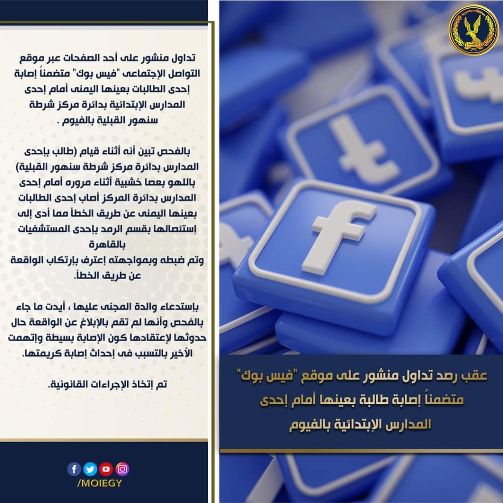 تداول منشور على أحد الصفحات عبر موقع التواصل الإجتماعى “فيس بوك” متضمناً إصابة إحدى الطالبات بعينها اليمنى أمام إحدى المدارس الإبتدائية بدائرة مركز شرطة سنهور القبلية بالفيوم .